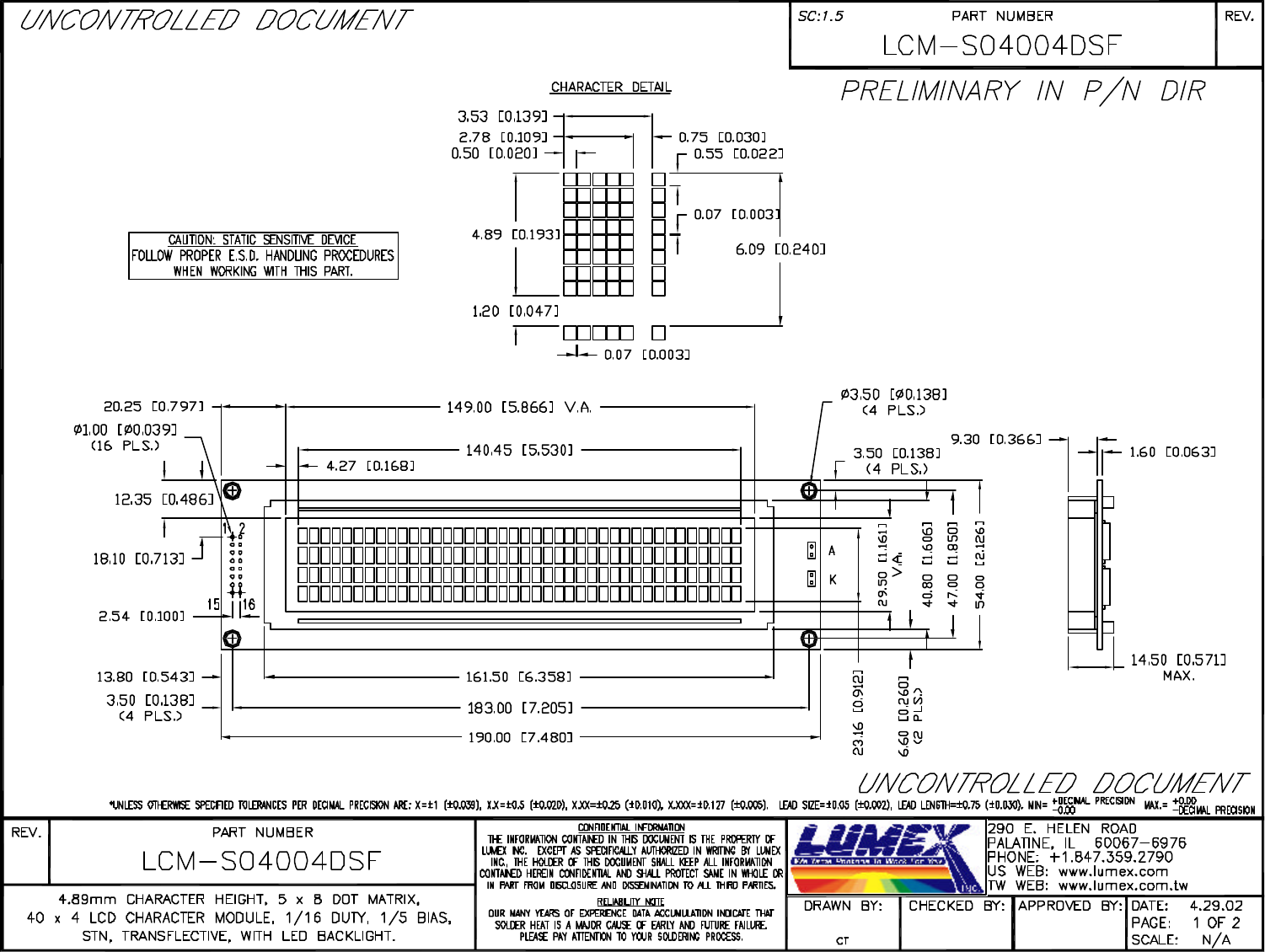 40 x 4 LCD CHARACTER MODULE. 1/16 DUTY. 1/5 EMS.