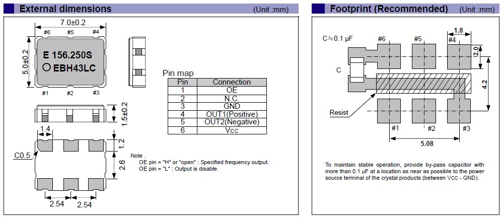 SG7050EBN operates from a 2.5 V or 3.3 V supply and is packaged in a 7.0 mm x 5.0 mm x 1.5 mm 6-pin ceramic SMD package. Operating temperature is -40°C to +85°C.