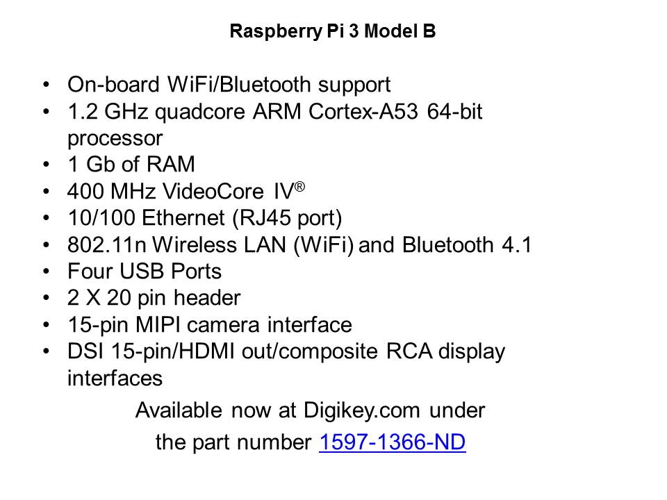 This slide provides a list of the features provided by the Raspberry PI 3 Model B which include on-board WiFi/Bluetooth support, a 1.2 GHz Quadcore ARM Cortex-A53 64bit processor, 1 Gb of RAM, 400 MHz VideoCore IV, 10/100 Ethernet from an RJ45 port, 802.1n wireless LAN (WiFi), and Bluetooth 4.1. This version has four USB ports, and a 2x20 pin header for connectivity, as well as a 15-pin MIPI camera interface, and DSI 15-pin/HDMI Out/Composite RCA display interfaces. The Raspberry Pi 3 Model B is now available at DigiKey, part number 1597-1366-ND.